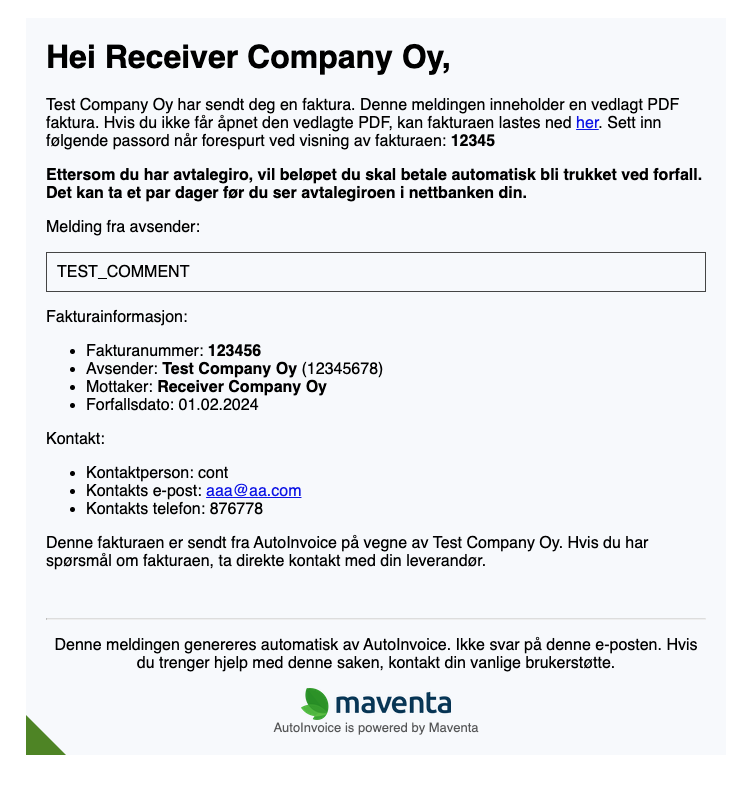 If the consumer wants a notification and neither eFaktura nor an email address is available, the notification is sent to print. Maventa adds a cover sheet to the invoice specifying that this is a direct debit and should not be paid.
